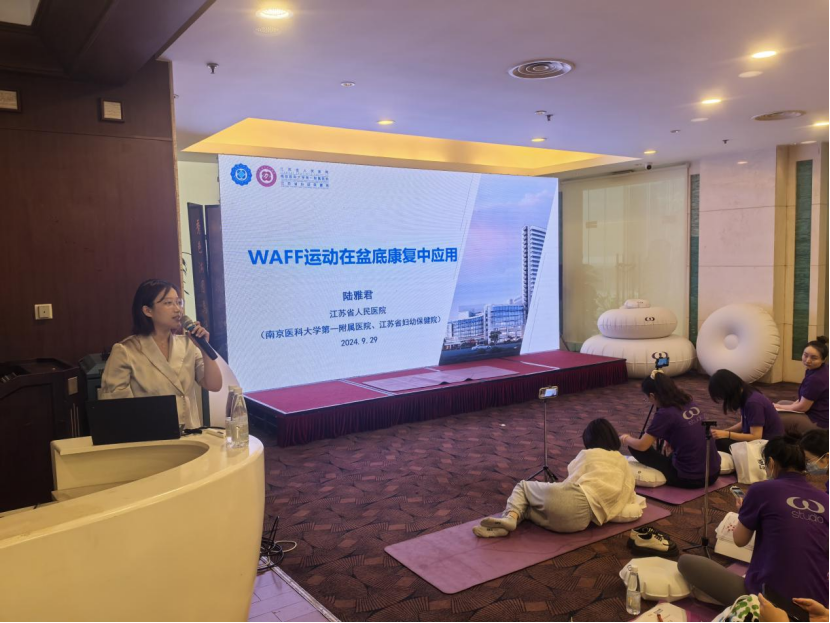 江苏省妇幼保健院女性康复治疗师沈玮与与欧亚迪斯国际交流中心刘萍华培训导师共同完成WAFF运动康复气垫动作教学,与现场学员们亲切互动,通过运动原理基础理论结合垫上动作指导,深入浅出地解析了WAFF气垫对于刺激内在感知、放松神经肌肉、稳定肌肉锻炼的功能及积极意义,学员们纷纷表示获益匪浅。 《WAFF运动在盆底康复中应用(感知和训练)》 -江苏省人民医院(南京医科大学第一附属医院,江苏省妇幼保健院) 陆雅君